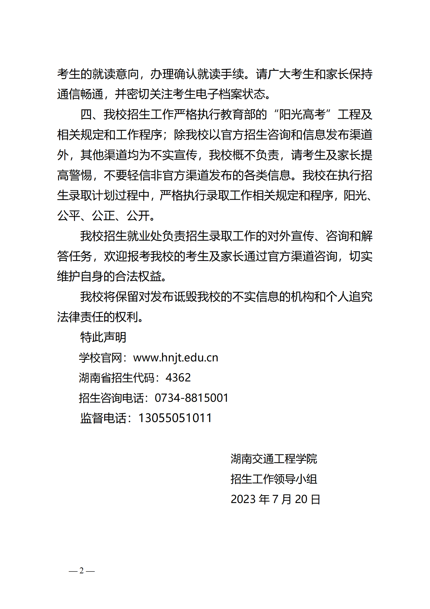 关于湖南交通工程学院2023年规范招生工作的严正声明